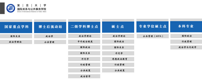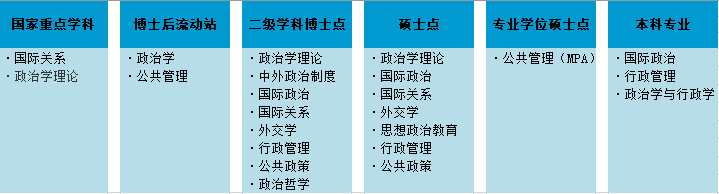 学院下设国际政治系、政治学系、公共行政系和外交学系,是全国公共管理硕士(MPA)专业学位首批培养机构之一。学院拥有国家重点学科2个(国际关系、政治学理论),国家哲学社会科学创新基地1个,上海市智库2个,国家网信办和教育部共建的网络安全和治理基地1个,国家级协同创新中心(第一参与者)1个,博士后流动站2个、一级学科博士点2个、二级学科博士点8个(其中自设博士点2个)、硕士点7个、专业学位硕士点(公共管理硕士)1个、本科专业3个。目前,学院共有在读本科生793人、全日制硕士研究生203人、公共管理专业学位硕士生(MPA)1285人、博士研究生182人、在站博士后29人,其中外国留学生总计226人。