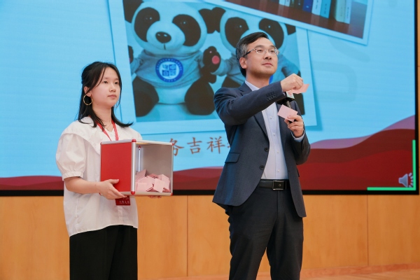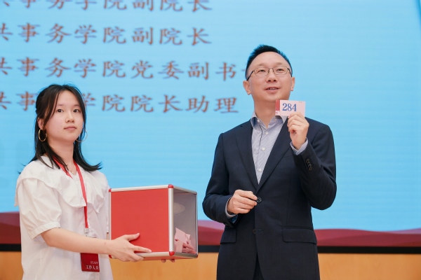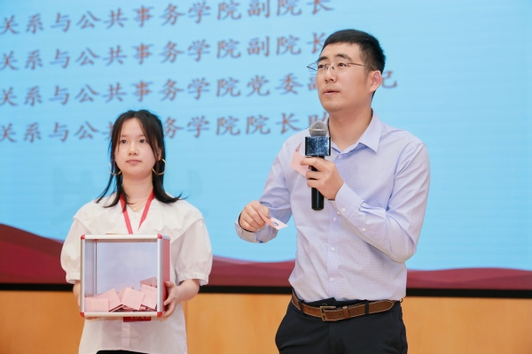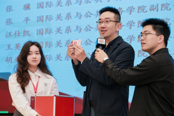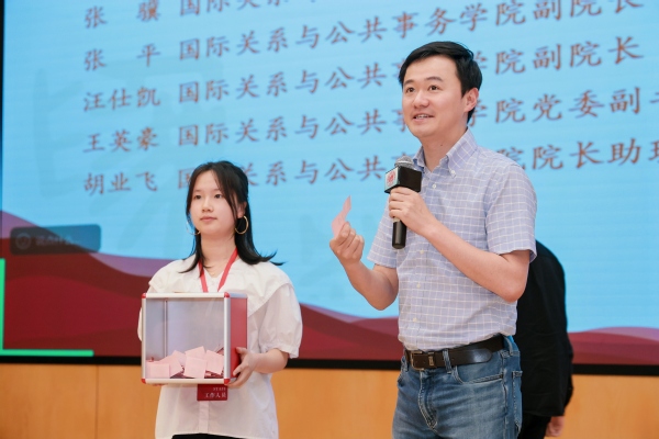 在抽奖环节,亚洲色图 副院长、外交学系主任张骥,亚洲色图 副院长张平、亚洲色图 副院长汪仕凯、亚洲色图 党委副书记王英豪、亚洲色图 院长助理胡业飞,为参与活动的院友们及国务“复二代”们抽奖。