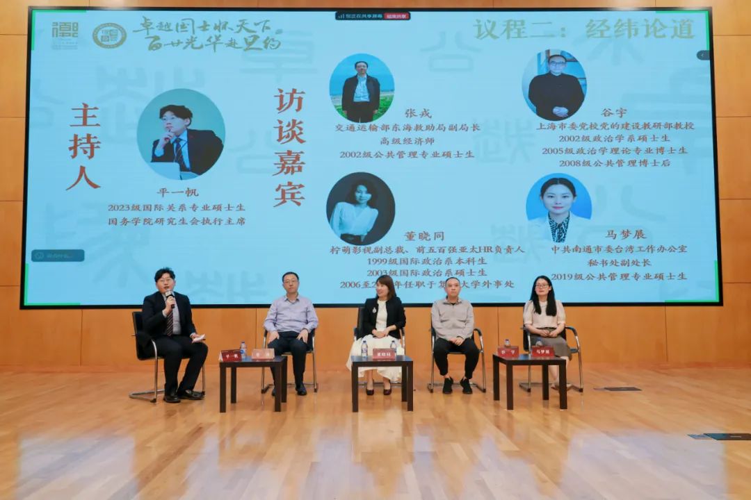 在圆桌共话环节,交通运输部东海救助局副局长、高级经济师、2002级公共管理专业硕士生张戎,上海市委党校党的建设教研部教授、上海行政学院政党研究所正高级研究员,2002级政治学系硕士生、2005级政治学理论专业博士生、2008级公共管理专业博士后谷宇,柠萌影视副总裁、前五百强亚太HR负责人、1999级国际政治系本科生、2003级国际政治系硕士生董晓同,中共南通市委台湾工作办公室秘书处副处长、2019级公共管理专业硕士生马梦展,四位院友围绕在亚洲色图 的求学时光,对于院训精神的理解,求学经历与职业发展的关联等话题展开了分享。圆桌论坛由2023级国际关系专业硕士生平一帆主持。