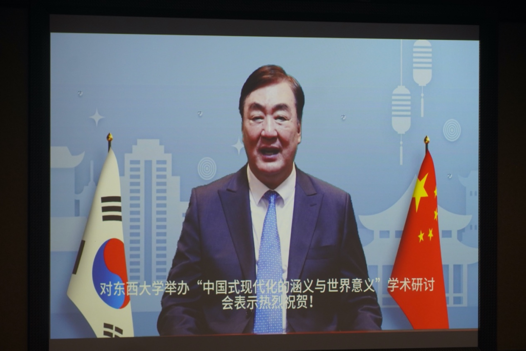 邢海明大使在线上对东西大学举办“中国式现代化的涵义与世界意义”学术研讨会表示热烈祝贺。他指出,实现现代化是世界各国人民的共同追求,也是近代以来中国人民矢志奋斗的梦想。中国作为负责任的大国,始终将自身发展与世界命运紧密联系,坚持同世界各国和平相处、合作共赢,推动构建人类命运共同体。中国提出并积极践行全球发展倡议、全球安全倡议、全球文明倡议,为完善全球治理、应对世界变局、破解人类难题贡献智慧和力量。过去几十年,韩国创造了举世瞩目的“汉江奇迹”,创新发展全球领先,社会治理卓有成效,成功走出了韩国式现代化道路。中国也从韩国的发展历程中汲取了很多经验。百花齐放春满园,我们愿同包括韩国在内的世界各国加强交流合作,互相成就、美美与共,让各具特色的现代化事业汇聚成推动世界繁荣进步的时代洪流,共同开创人类更加美好的未来。