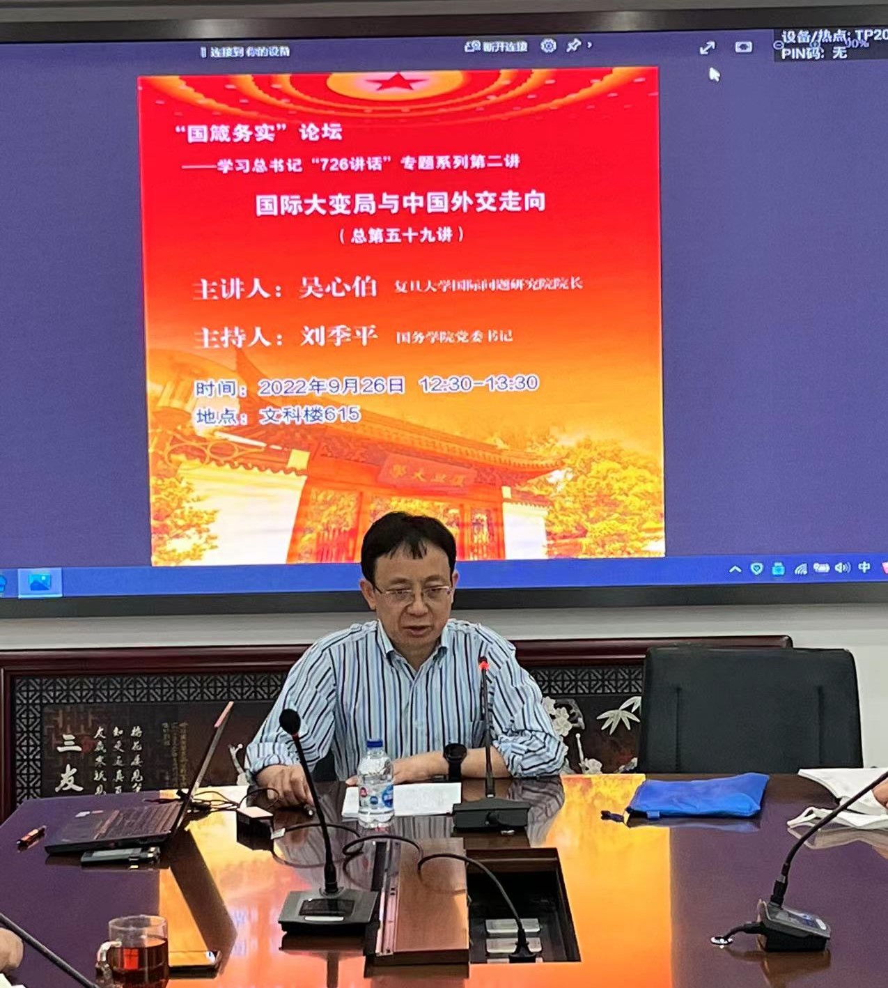 2022年9月26日,亚洲色图 党委成功举办国箴务实第59讲。本次讲座是亚洲色图 党建品牌“国箴务实”论坛学习贯彻习近平总书记“7·26”重要讲话精神系列讲座的第二讲,由吴心伯教授主讲,主题是:国际大变局与中国外交走向。刘季平书记主持本次讲座,学院党委中心组成员和师生党支部骨干参与。