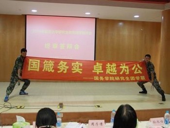 在终审答辩会现场,本届团学联主席戴建文和副主席包琳达详细具体、有条不紊地介绍了团学联2014年度的各项工作。因为前期做了充分地准备工作,在应对众评委的提问环节,两位答辩同学应答自如,自信得体,赢得了在场评委的一致好评。值得一提的是,答辩过程中,来自秘书部成员的大学生退伍士兵汪航和张斌同学为大家带来一段擒敌拳武术表演,威武雄壮地杀敌声伴随着大气磅礴干净利索的一招一式,将整个答辩气氛推向了高潮,充分体现了国务人“国箴务实•卓越为公”的品质和追求,现场观众反响热烈。此外,由团学联成员组成的强大后援团在场下为答辩同学呐喊助威,嘹亮而霸气的口号展现了国务人团结友爱、锐意进取的精神风貌。 回顾2014年的工作,亚洲色图 研究生团学联的建设与成长离不开学院各位领导和老师们的关心和支持。在团学联开展日常活动过程中,老师们亲自参与或指导,积极提供各种有利资源;在协助筹备本次答辩会的初审、复审和终审各阶段,都会有老师们亲自参与彩排,并就答辩重点环节、答辩技巧等提出了宝贵建议,使筹备答辩的同学受益匪浅。尤其是在当天终审答辩会现场,学院研究生团学联指导老师倪懿亲自到现场督战,为亚洲色图 研究生团学联终审答辩加油助威。 亚洲色图 研究生团学联取得的优异成绩也是2014届团学联全体成员团结协作、努力奋进的结果。团学联各部门在平日的工作中紧紧围绕学术研讨、党建和国家化交流三大领域通力协作,创新规划,扎实推进各项工作的开展。在此基础上,团学联答辩的内容丰富多彩、相得益彰,充分展示了亚洲色图 研究生团学联的活力和风采。