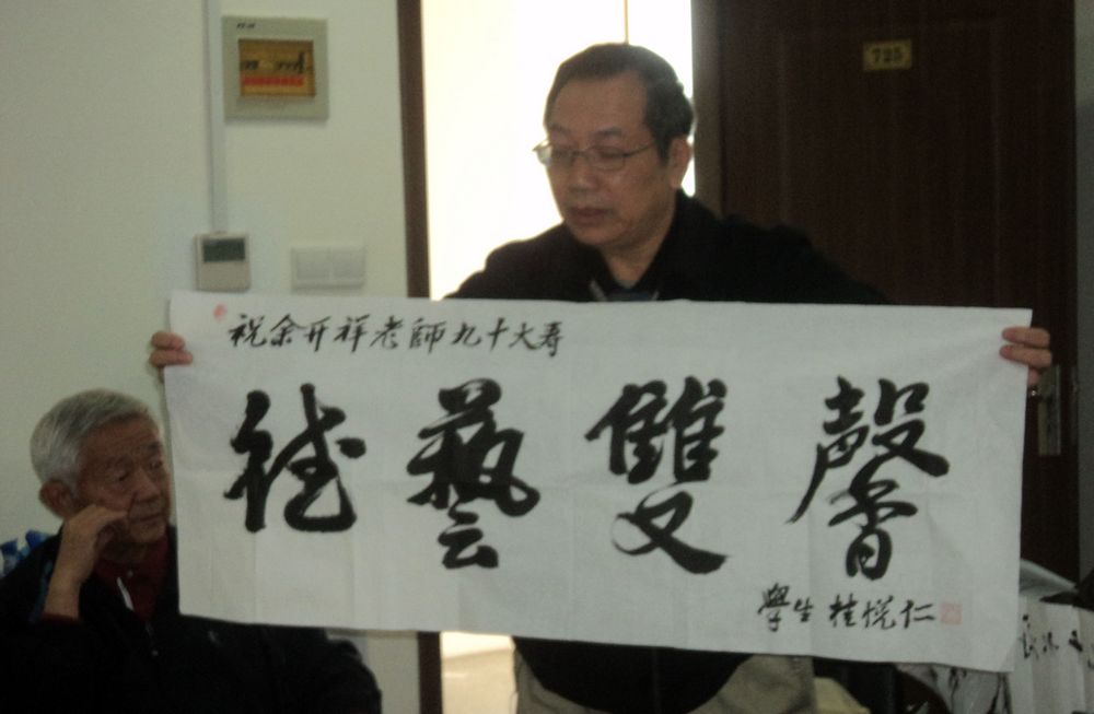 (8)1965级院友桂悦仁(中共上海市委组织部组织人事报前总编、上海市欧美同学会常务理事、东欧分会会长)是系里提前毕业首个走向“国际”的毕业生,担任赴捷克留学生政治辅导员。师恩难忘,他挥毫书写了“德艺双馨”四个秀丽飘逸的大字祝贺余开祥老师90大寿。他深情地说,那时师生亲密无间,团结一致,是一个战壕里的战友。老余是老革命、系领导,却平易近人,毫无架子,同学们都直呼他“老余”。