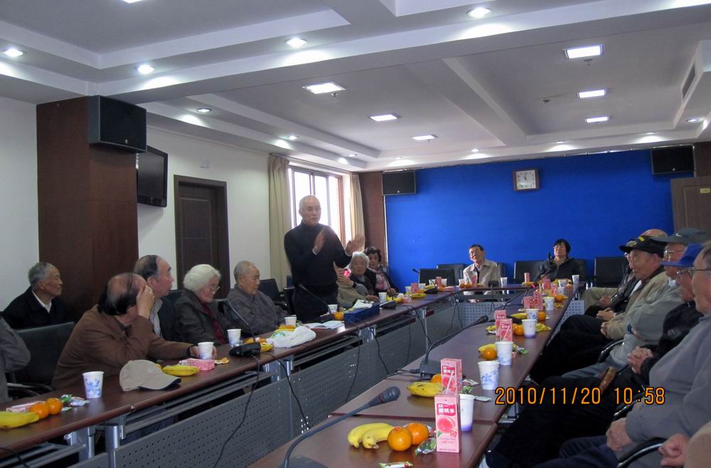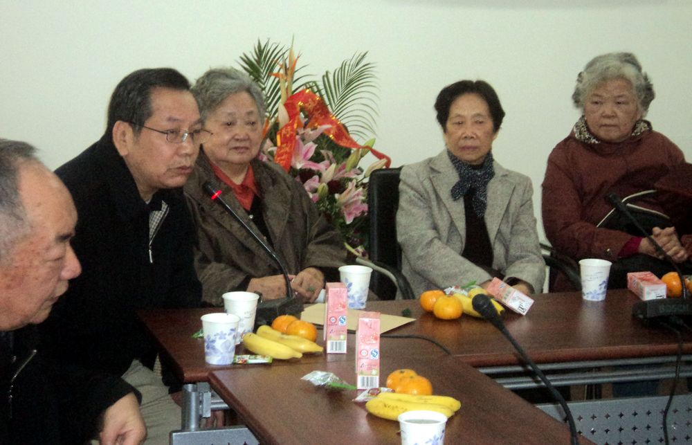 (1)2010年11月20日上午,亚洲色图 文科楼725会议室内充满了欢声笑语。长桌的一头摆放着一个香气四溢、色彩缤纷的花篮。花篮里插着各是9枚的百合花、郁金香、蝴蝶兰等花卉,寄寓吉祥美好。红缎带上写着贺词。亚洲色图 领导、国政系老领导、老教师和1965级院友欢聚一堂,庆贺国政系首届毕业生进校50周年暨余开祥教授90华诞。握手、问好、酬联、赠书、座谈、放歌、献花、留影,一组组场景洋溢着浓浓师生情。图为亚洲色图 党委书记沈兰芳研究员(左2)、亚洲色图 常务副院长、博导林尚立教授(左3)、盛善珠(副研究员,国政系原总支书记,后任上海大学党委副书记)(右1)、潘玲娣(副研究员,国政系原总支书记)(右2)。