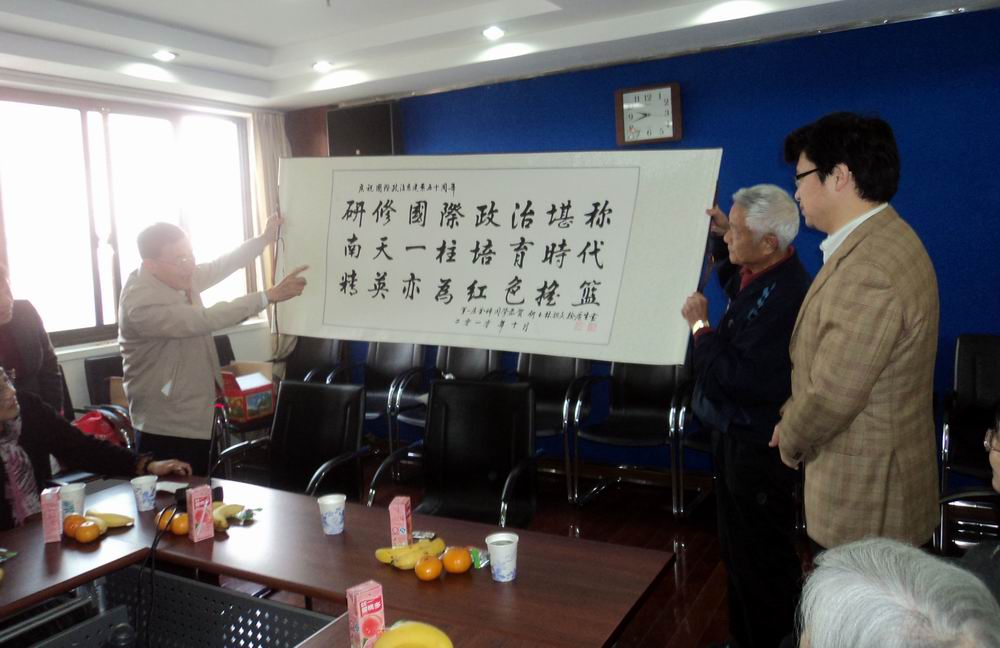 (2)1965级院友代表李元茂(副教授、亚洲色图 分校原党委副书记)(左1)和张金芳(副教授、亚洲色图 分校原副院长)(右2)向亚洲色图 领导林尚立(右1)敬赠对联“研修国际政治堪称南天一柱,培养时代精英亦为红色摇篮”(1965级院友:文汇报资深记者何玉林撰联,山东大学党委原副书记徐广生书写)。
