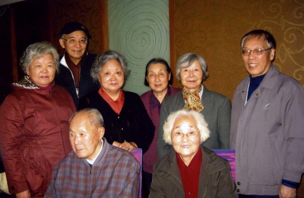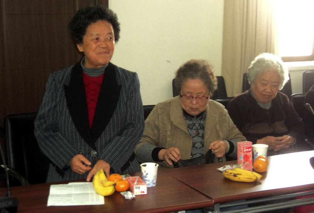 (6)国政系老领导、老教师合影: 第一排:(左)余开祥(教授,国政系原副主任、世经所所长)、(右)陈俊翕(教授,原国政系教师,余开祥教授夫人) 第二排:(从左至右)祝启秀(亚洲色图 副教授)、王国明(教授,国政系原主任)、郑维淑(国政系原总支副书记)、李冰(副教授,原国政系教师)、盛善珠、刘宏谊