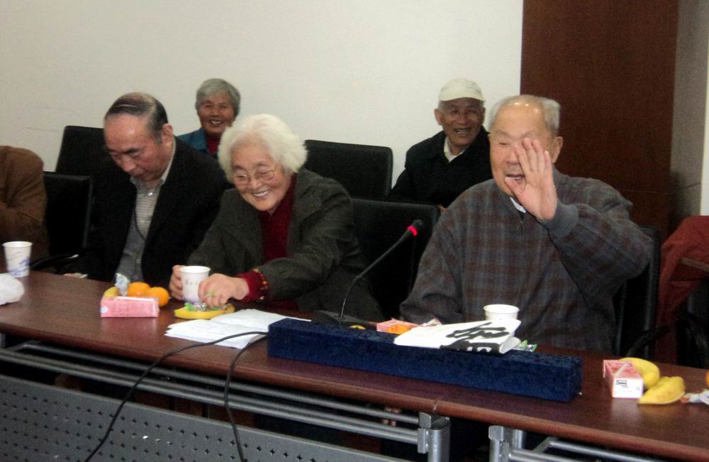 (10)居住在广州的1965级院友曾云玉(左1)听说母校举办活动,便乘火车匆匆赶来。她站起来激动地说:“不请也要来!国政系不仅是学知识的课堂,而且是团结友爱的集体、温馨的大家庭。”她牢记“要做有用的人才”的教导,工作兢兢业业,任劳任怨,多次被评为优秀共产党员和先进工作者。最后她放声演唱了一首粤语康健延寿歌,献给老寿星余开祥老师。 右1和右2分别为1965级院友胡巾雄、谈仪珍。