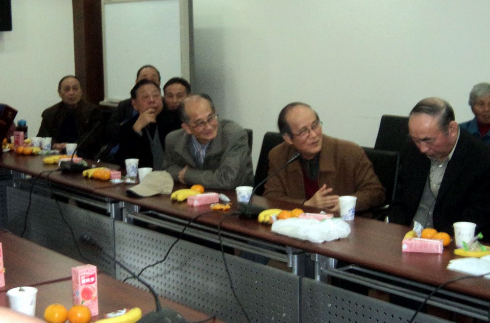 (3)听了几位弟子的肺腑之言,国政系老副系主任余开祥教授(右1)感慨地说:“回忆国政系50年历程,师生共同努力,艰苦奋斗。有一个同志,我们要牢记:老系主任吴常铭,他为人谦虚,常对我说,‘我是不懂的,业务上要靠你。’我对吴常铭同志很敬重,凡是他讲课,我都去听。他讲得比我好多了。”他又说:“我今年89岁,有信心活到120岁。健康长寿需要:心态平衡,不要与人比高低;经常散步,不要坐着不动;自编一套健身动作锻炼;老有所乐,我爱好京戏和西洋古典音乐;老有所思,到一个地方,我便去书店,买几本好书。”