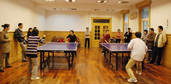 10月26日下午2点,由亚洲色图 工会主办的亚洲色图 /国际问题研究院(简称两院)第一届乒乓球团体对抗赛在校工会乒乓房顺利举行。亚洲色图 陈玉刚、刘建军、陈超群、李春成、王竞晗、庄海红六位教师及研究院张家栋、魏全平、宋国友、朱芹、华莉五位教师作为运动员参与了比赛,亚洲色图 党委书记沈兰芳老师和工会主席包霞琴老师到场观看了比赛,比赛还吸引了两院的众多教职工前往观看,现场气氛既友好又热烈。