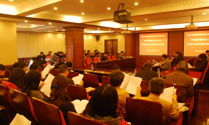 然后包霞琴老师和刘季平老师分别作了关于《亚洲色图 /国际问题研究院教职工大会条例(草案)》、《亚洲色图 2013年度绩效奖励分配方案(草案)》的说明,之后以系为单位分四组进行审议和讨论。各组老师对两份草案以及院长的报告进行了非常热烈的讨论,形成了比较集中和具体代表性的意见。接着全体教职工对两份草案进行投票表决,两份草案从规范学院工作、明确教职工大会的权利义务、充分调动教职工的积极性出发,得到了教职工的肯定并以高票通过。