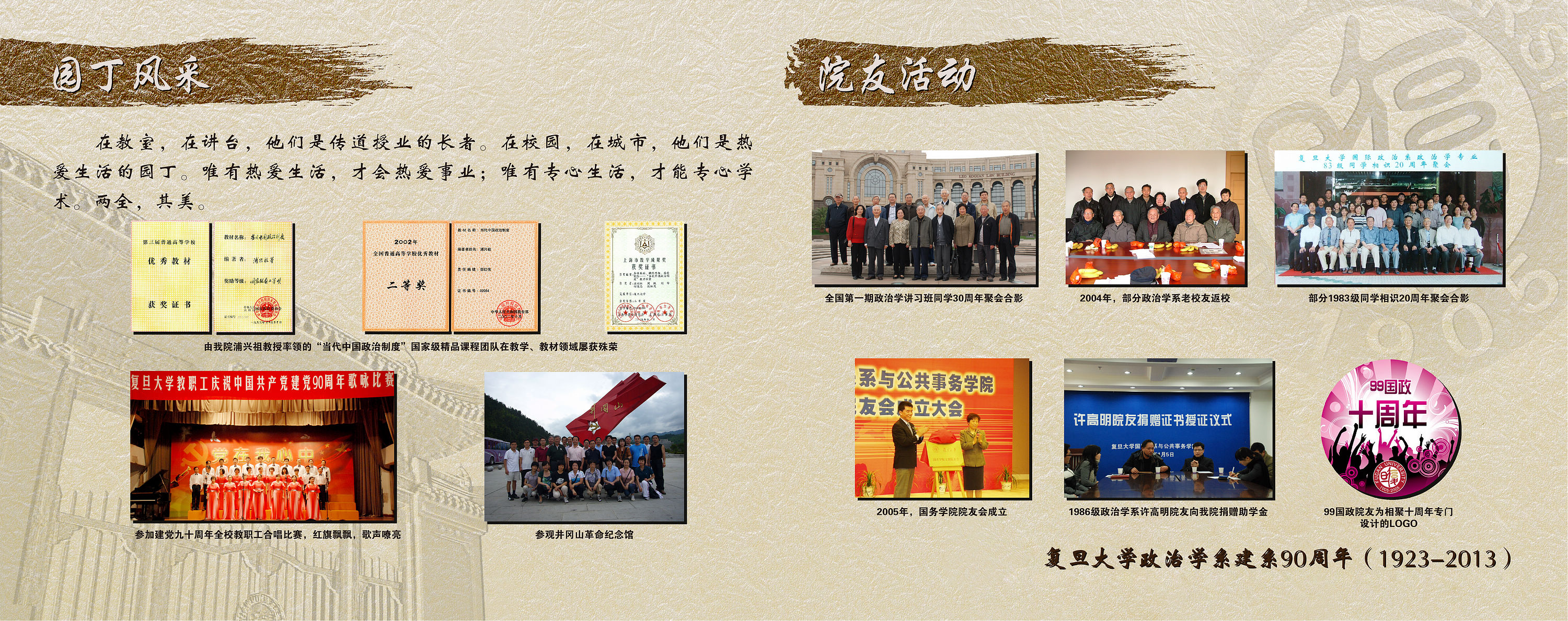| 高清图下载: 1-13-01.jpg 后 记 自一九二三年建系至今,复旦政治学系经历了命运的起伏跌宕,见证了民族的荣辱艰辛,也迎来了国家的繁荣富强。我们珍惜过往,不仅缘由那些动人的传统和温暖的记忆,更是因为这份坚实的根基和美丽的理想。岁月积淀下的,是求学问道的沉静,时光带不走的,是胸怀天下的情愫。在这所巍巍学府中,复旦政治学人,秉承优良的历史传统,焕发无穷的蓬勃朝气,依凭谨严的治学风范,师生一心一德,员工必信必忠,博学而笃志,切问而近思,满怀信心地在时代的春风里坚定前行。经过九十载的沧桑风雨,我们在光阴荏苒中不断成长,如今,复旦政治学系正站在新的历史起点之上,卿云灿烂,风起帆扬! |