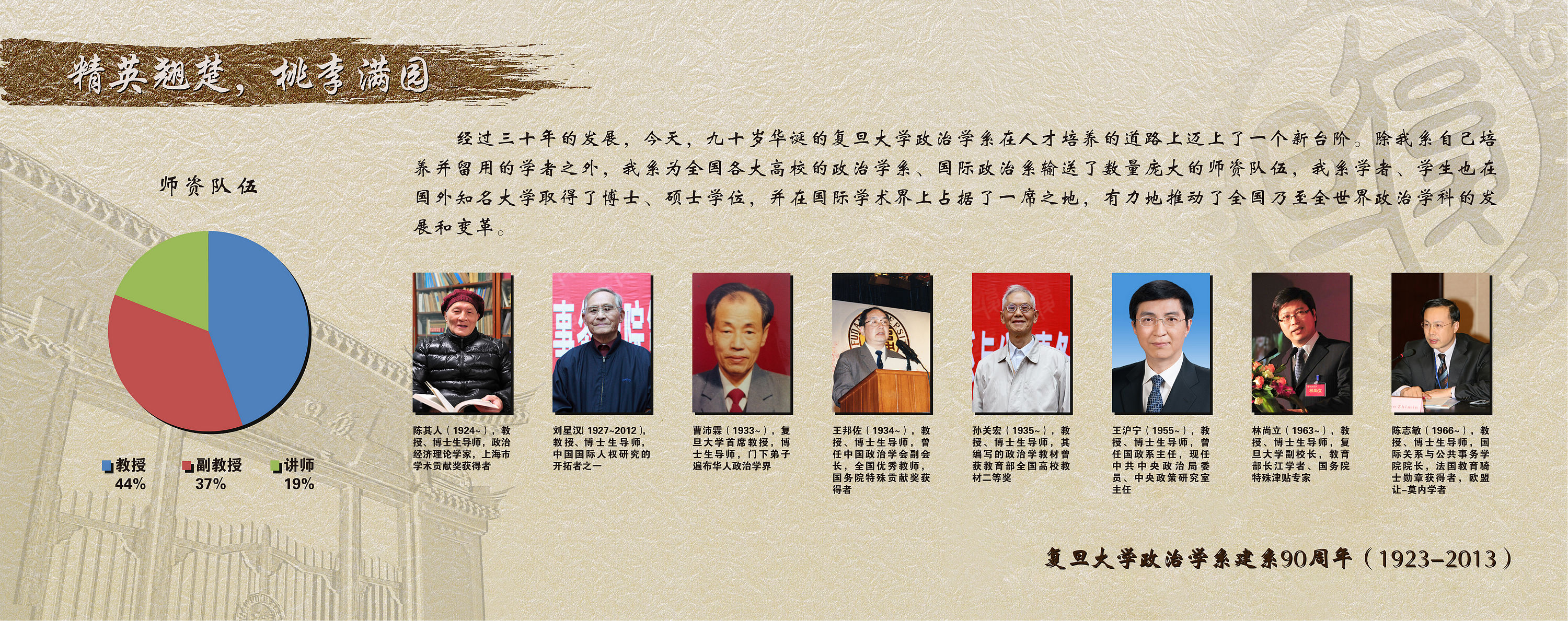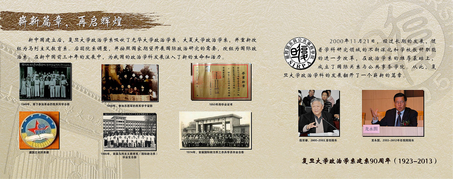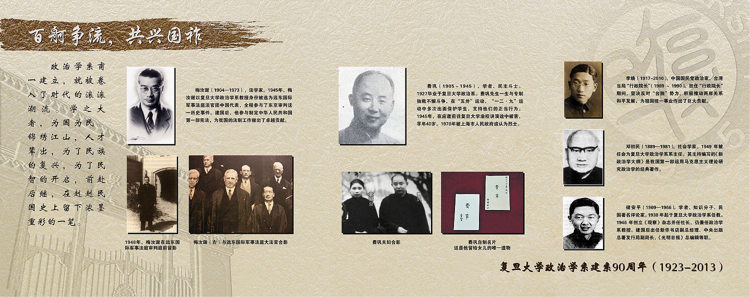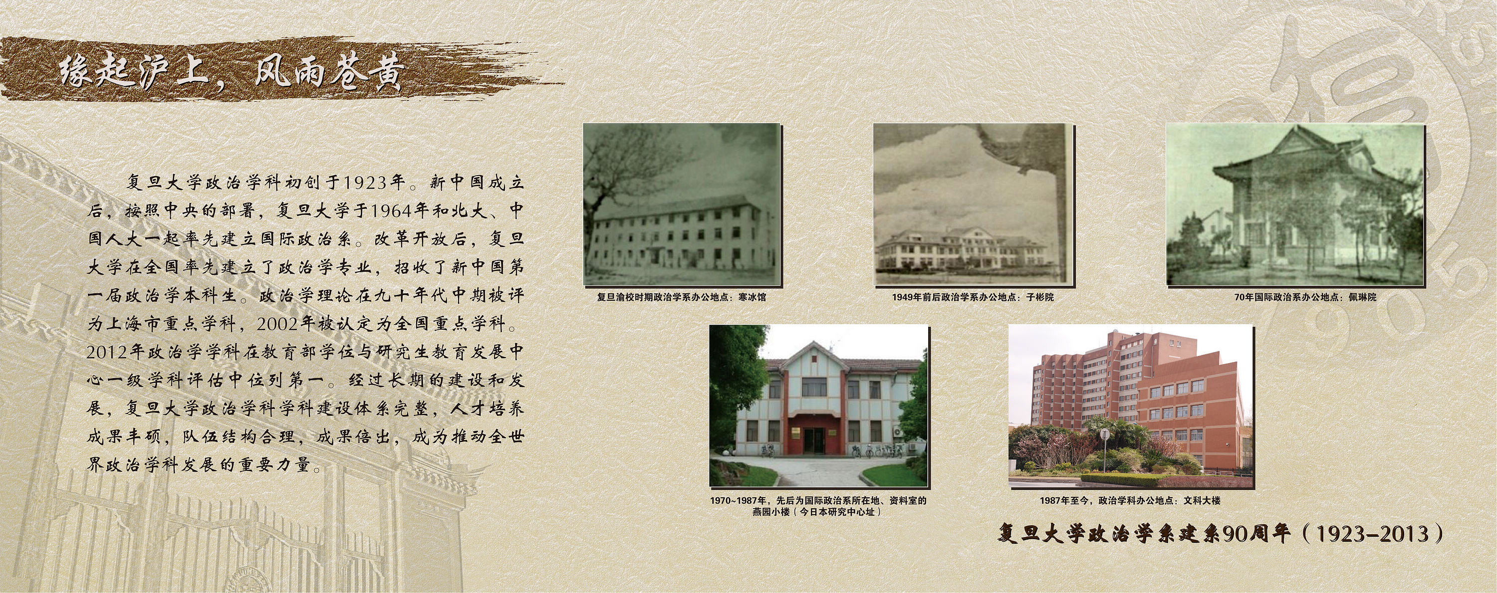 政治学系建系90周年(1923-2013) 复旦政治学系,发轫于旧时代风雨晦暗之际,筚路蓝缕,创业艰难。再经新政权重整山河之时,风云际会,跌宕起伏。幸得复兴于国家改革开放之后,薪火传承,开拓新篇,终成今日蔚然大观。纵览九十载沧海桑田,莫不与家国天下命运相联。 复旦政治学系,近百年精进不懈,以坚忍之努力问道政学之经纬,以辛勤之耕耘作育海内之英才,以良苦之用心关怀国家之福祉。兼具精英意识与大众情怀,读经问典,教学相长,遂得桃李天下;务求独立精神与自由思想,经世济民,学以致用,乃有道德文章。 复旦政治学系,载厚重历史之积淀,谱杨柳新枝之词曲。前辈苦心经营之事业,正是我辈奋发进取之根基。面对世界浩荡潮流,怀抱民族复兴梦想,政治学系必将承前启后,矢志不移,砥砺前行,和衷共济!凭此卓越信念与光荣使命,定能代代相传,生生不息,同享日月光华,旦复旦兮! |