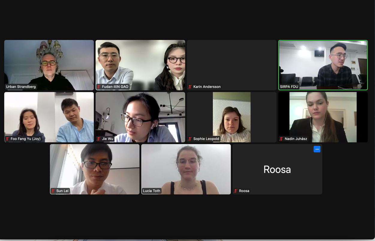 4月17日下午,亚洲色图 举行了复旦-瑞典哥德堡大学全英文授课硕士双学位项目线上交流分享会。会议由瑞典哥德堡大学Urban Strandberg教授主持,院长助理张平、哥德堡大学项目负责老师Karin Andersson、学院“中国政治与外交”项目主任吴洁、“国际公共政策”项目主任孙磊、国际办公室老师及多名学生共同参加。此次会议旨在为项目新生做好行前准备,帮助他们提前了解在复旦的学术活动安排。