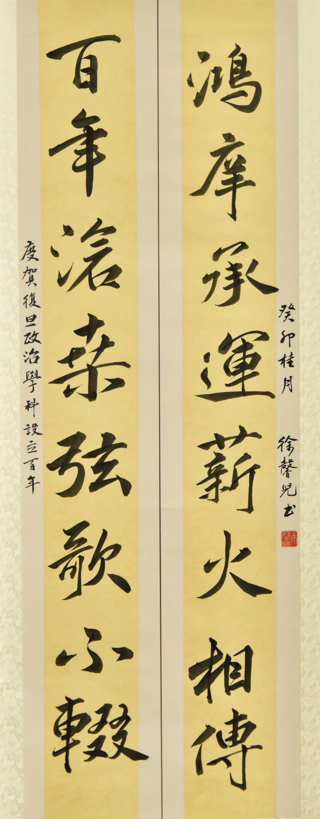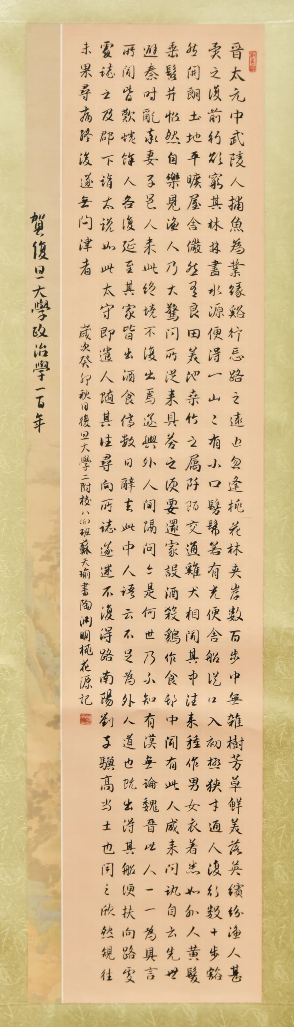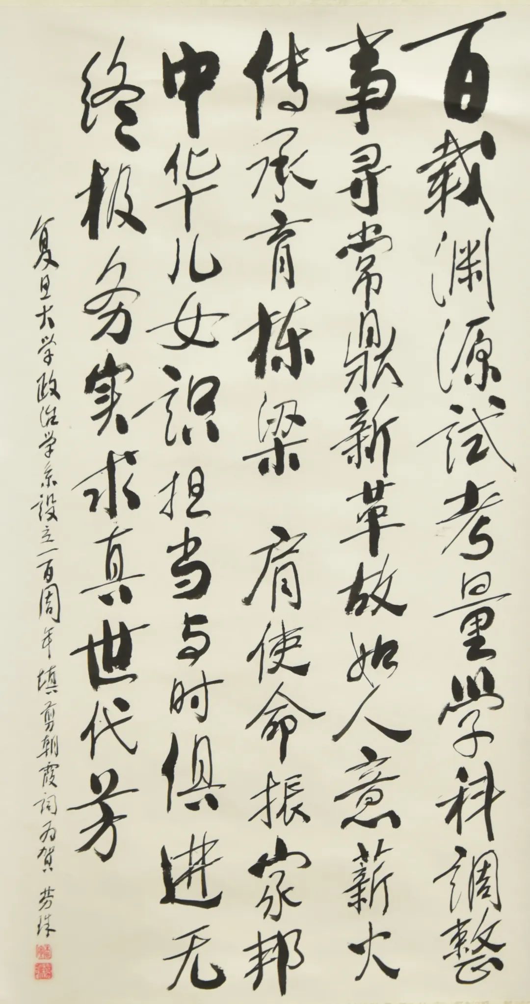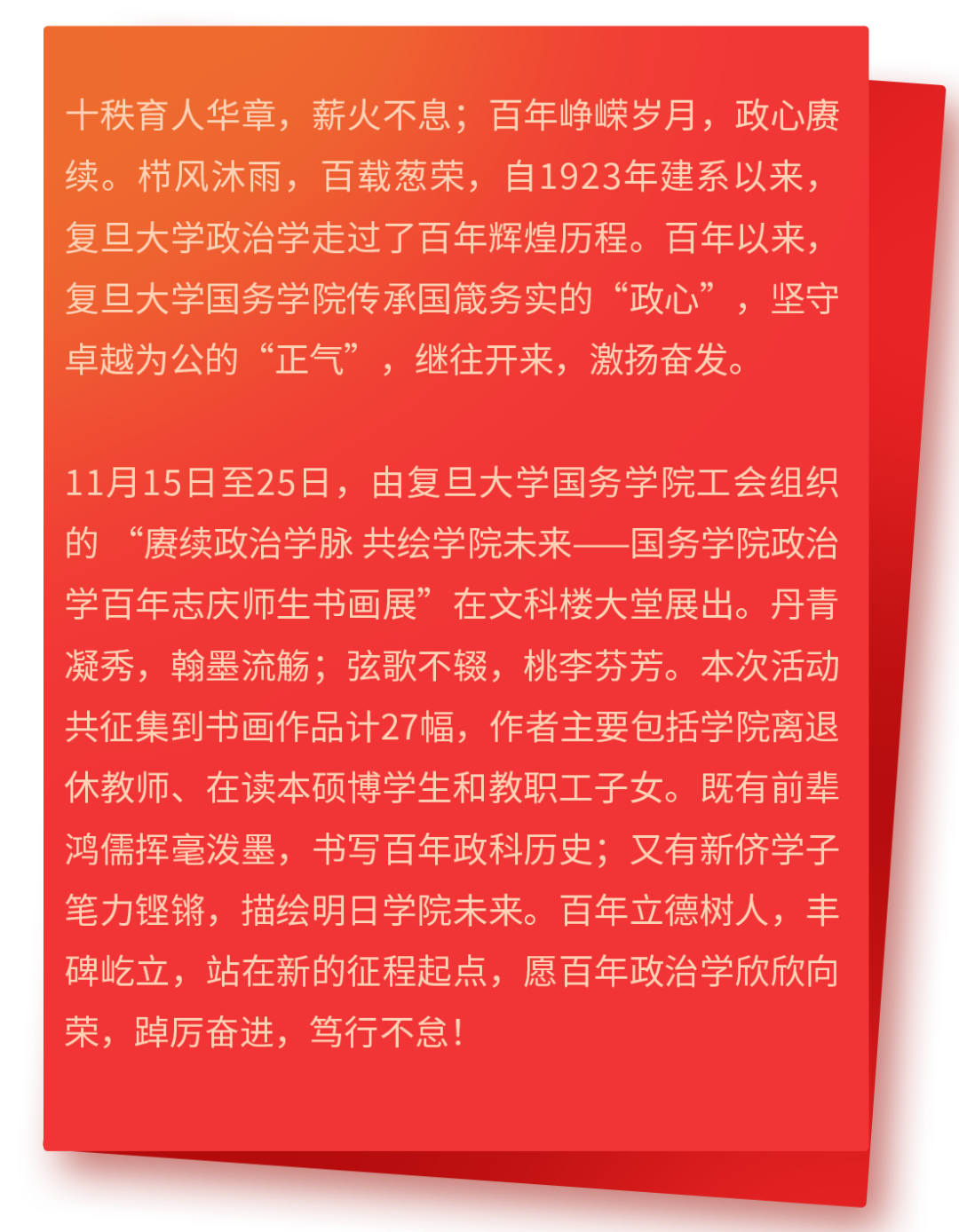 在读学生充分发挥个人才华,作品从拙朴的章草到灵秀的小楷、清俊的小篆,从刀笔画到综合材料制成的画作,《问学》是对政治学习之路上下求索的刻画,《初心如磐践》是对政治学人品格的勾勒,《复旦政科百年赋》等作品是对政治学百年历史的歌颂。通过融合古典与现代的灵感,同学们用笔墨和技艺抒发对当下政治学习的美好感触。
