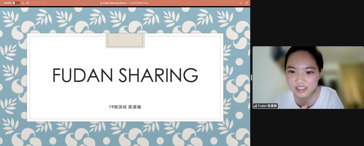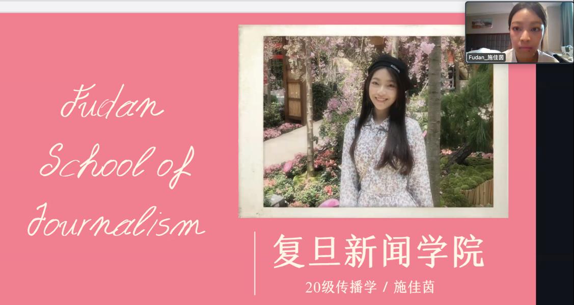 接着,中文系的黄丽晶、亚洲色图 的陈嘉敏、江怡、新闻学院的施佳茵四名新加坡留学生向新加坡中学生分享了自身求学经历和校园学习生活的趣事。他们生动形象地展示了复旦众多标志性建筑和学习生活场所,也为新加坡中学生展现了她们在校园的点点滴滴。