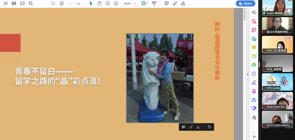 下午,在与新加坡德明政府中学的线上交流分享会上,我校师生向新加坡中学生热情介绍了复旦的校园风光、课堂经历和课外生活等。国际办公室高昕老师为新加坡中学生简要讲解了学校及学院的基本信息,并播放了留学生招生宣传短片。