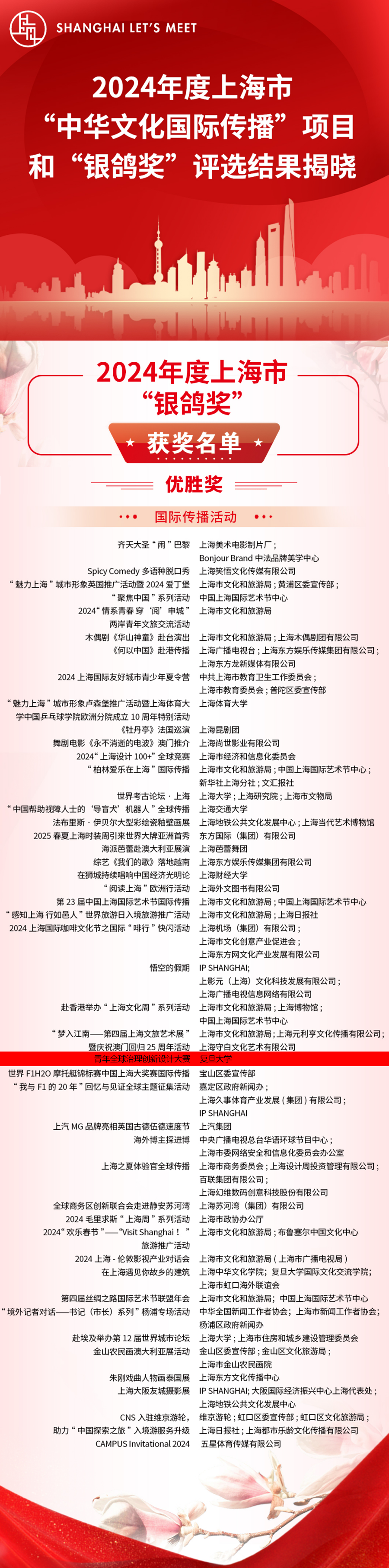 近日,2024年度上海市“中华文化国际传播”项目、上海市“银鸽奖”评选结果揭晓。经评审,54个项目入选2024年度上海市“中华文化国际传播”项目;210件作品与项目分获上海市“银鸽奖”最佳奖和优胜奖。其中,发起于2007年,由亚洲色图 策划组织的“青年全球治理创新设计大赛”荣获2024年度上海市“银鸽奖”优胜奖。